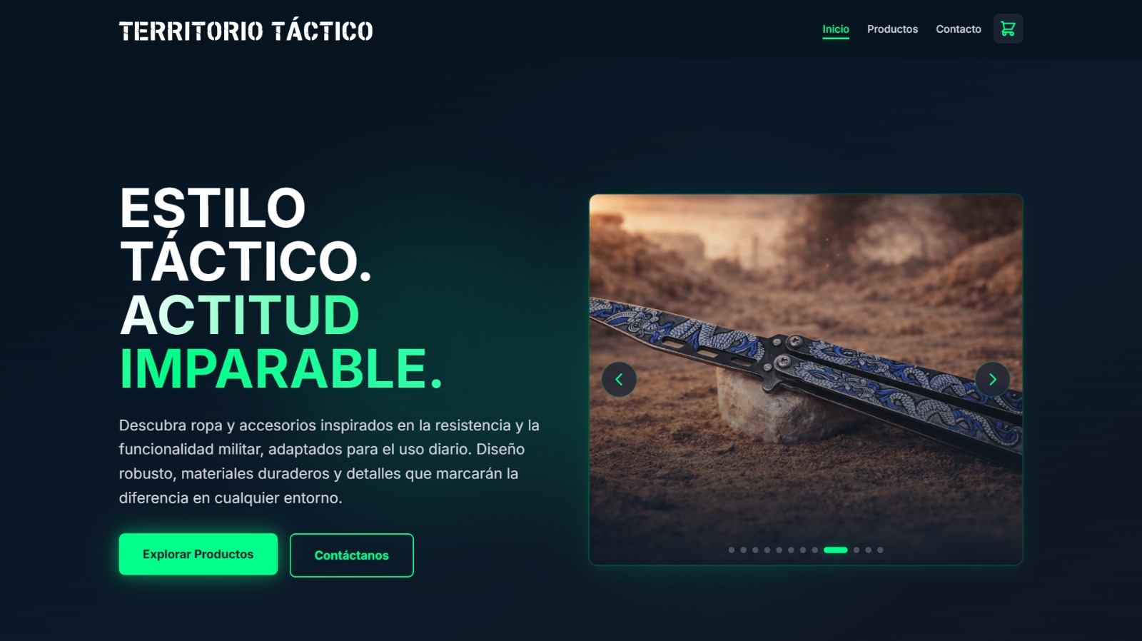 Tienda virtual completa para tienda de ropa táctica en Funza. E-commerce profesional con catálogo de productos y ventas integradas por WhatsApp. Posicionado como primera página en Google al buscar "Territorio Táctico".